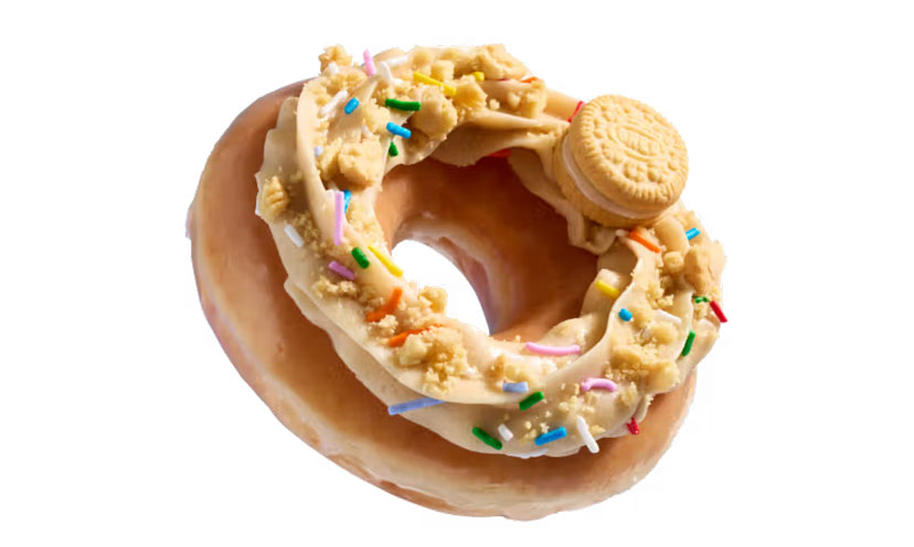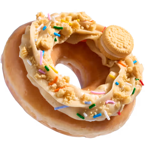 Think sunshine in doughnut form. An Original Glazed doughnut topped with Golden OREO-inspired buttercreme, Golden OREO cookie crumbles, rainbow sprinkles, and a Mini Golden OREO cookie right on top.